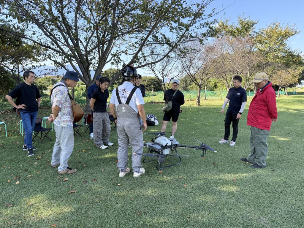 当日は、まず講師から農薬散布ドローンの仕組みや安全運用のポイントを解説。